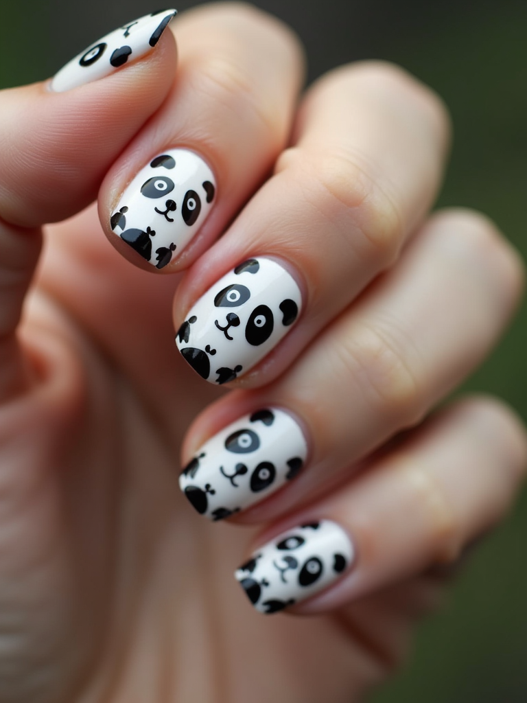 nails with cute panda bear designs, black and white with bamboo accents, playful hand pose, macro photography focus