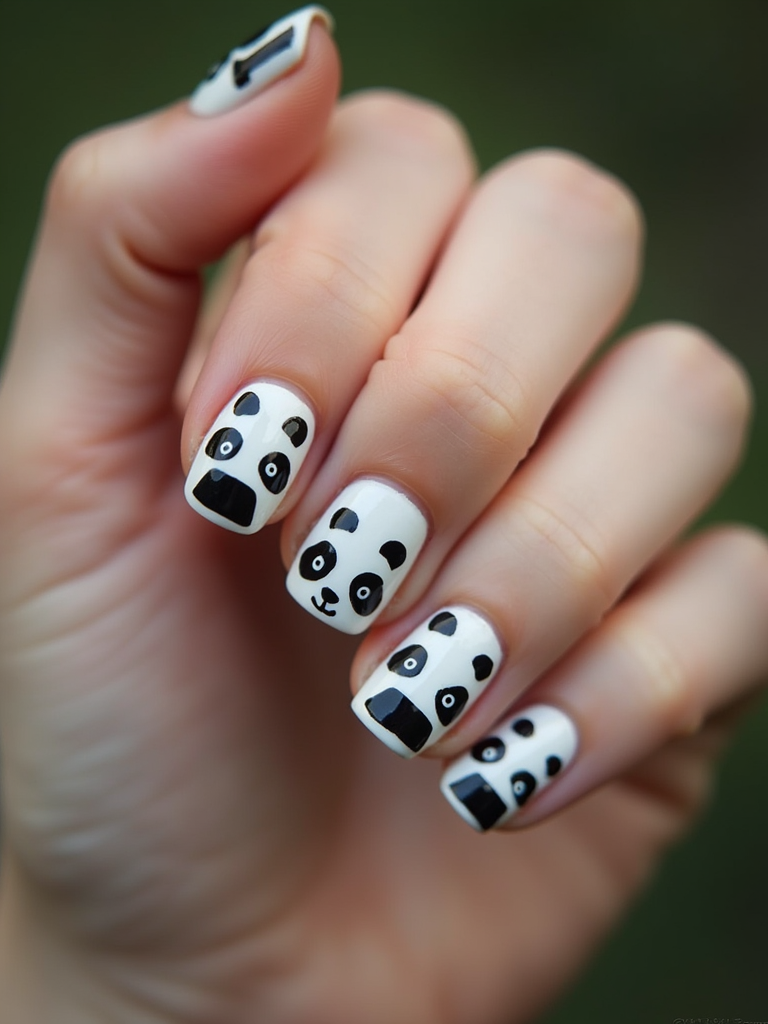 nails with cute panda bear designs, black and white with bamboo accents, playful hand pose, macro photography focus