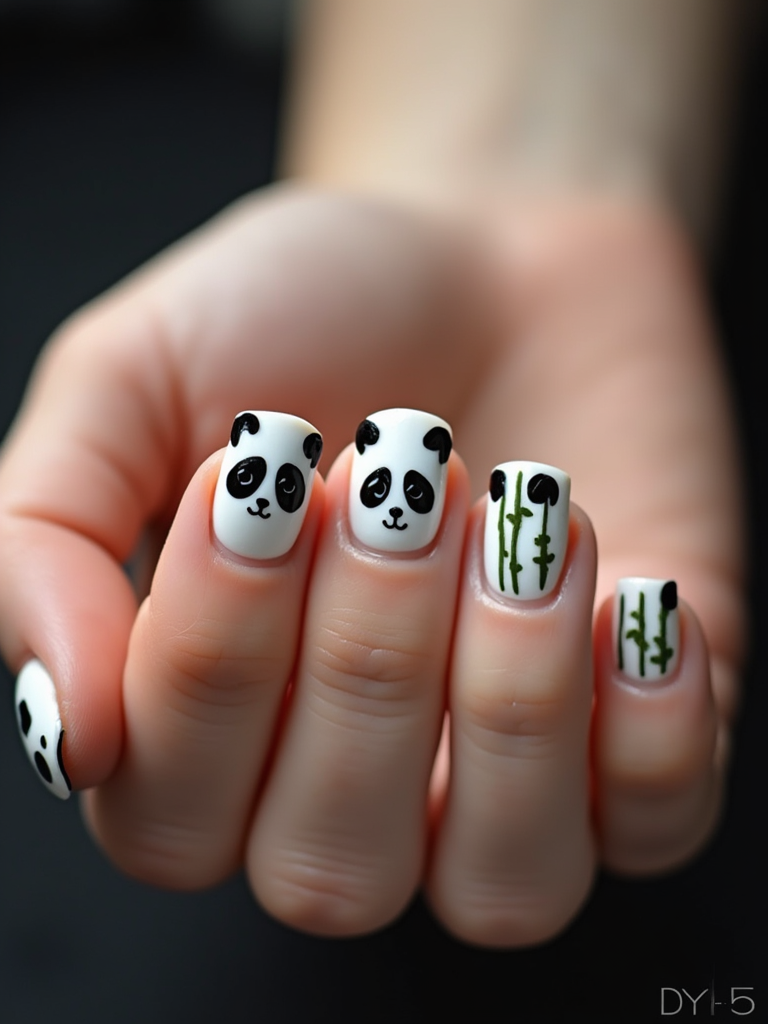 nails with cute panda bear designs, black and white with bamboo accents, playful hand pose, macro photography focus
