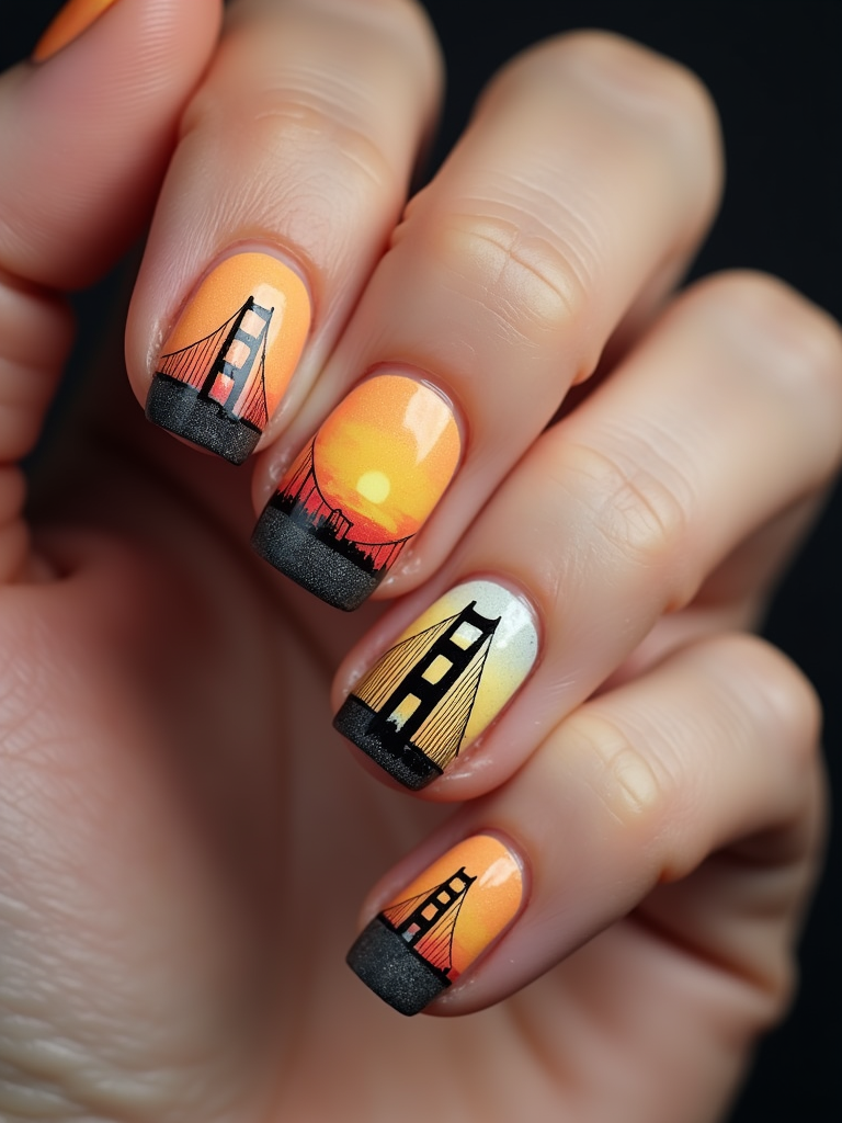 nails with detailed Golden Gate Bridge design, San Francisco skyline at sunset, clean softbox lighting, posed fingers with high gloss