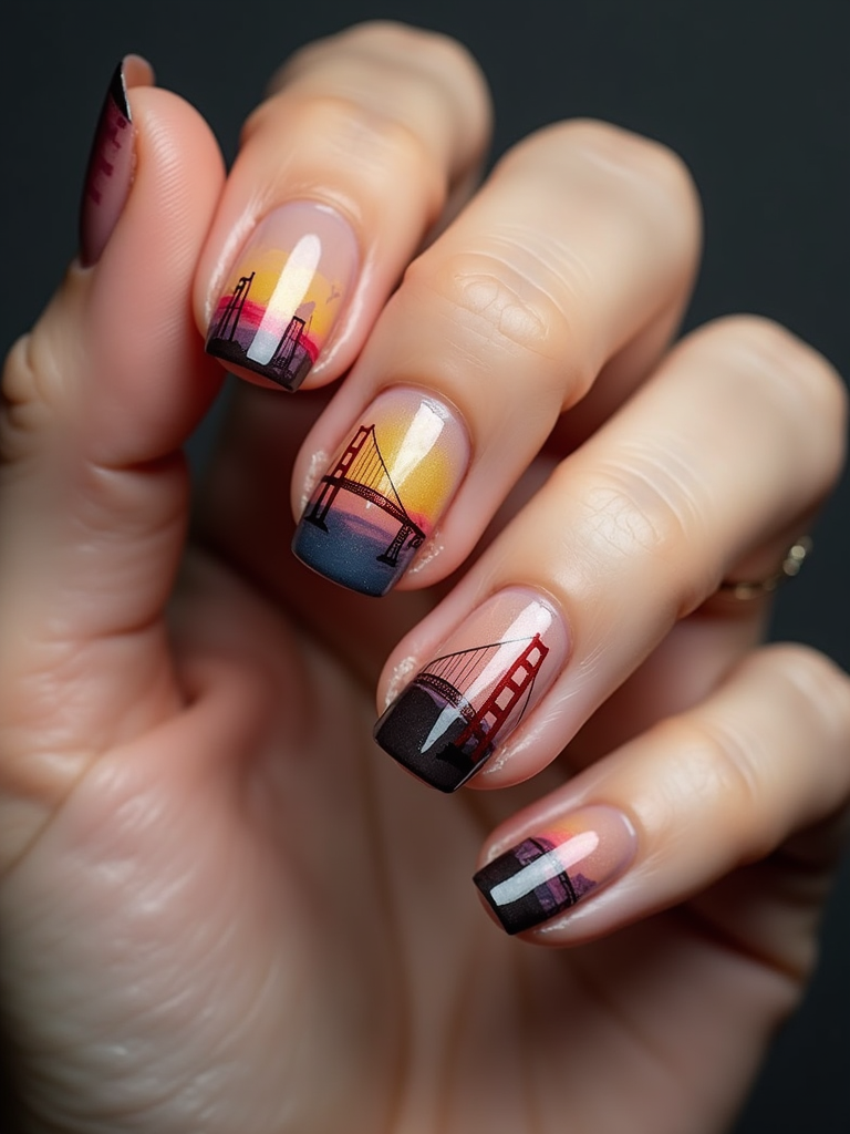 nails with detailed Golden Gate Bridge design, San Francisco skyline at sunset, clean softbox lighting, posed fingers with high gloss