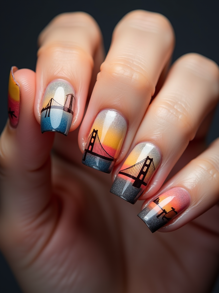nails with detailed Golden Gate Bridge design, San Francisco skyline at sunset, clean softbox lighting, posed fingers with high gloss