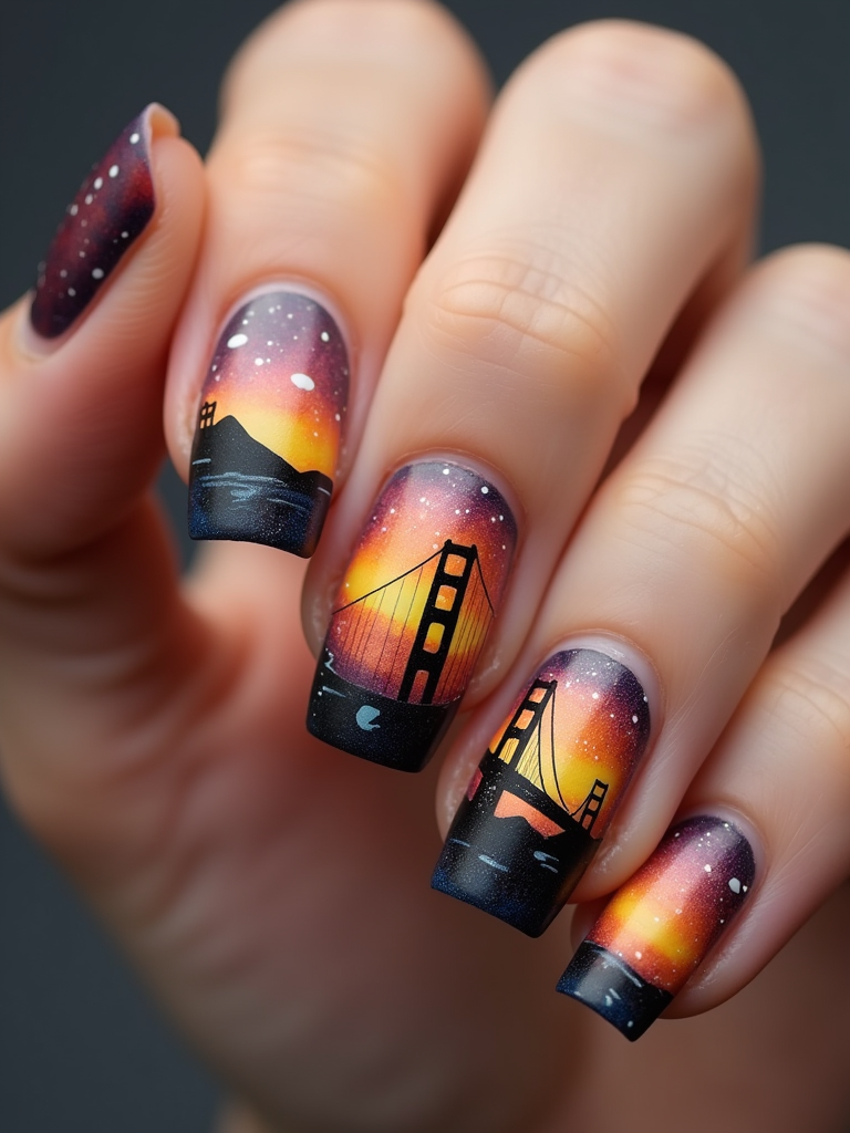 nails with detailed Golden Gate Bridge design, San Francisco skyline at sunset, clean softbox lighting, posed fingers with high gloss