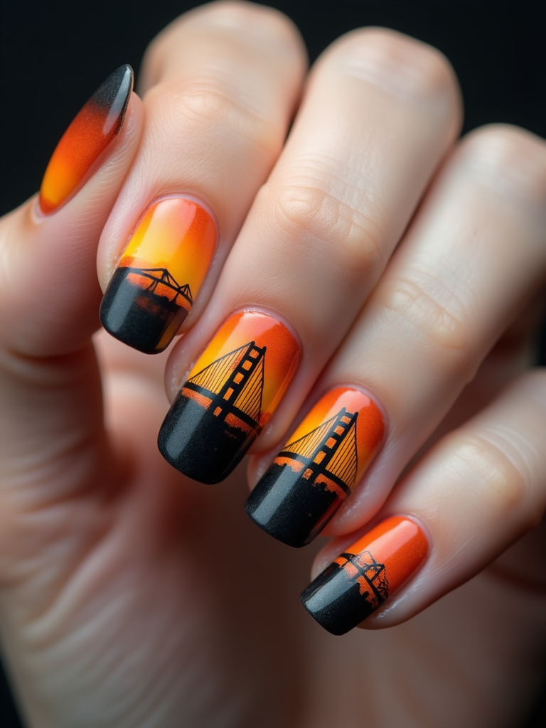 nails with detailed Golden Gate Bridge design, San Francisco skyline at sunset, clean softbox lighting, posed fingers with high gloss