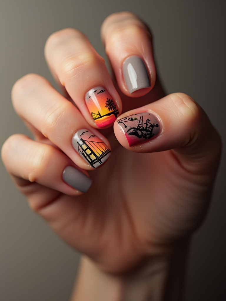 nails with detailed Golden Gate Bridge design, San Francisco skyline at sunset, clean softbox lighting, posed fingers with high gloss