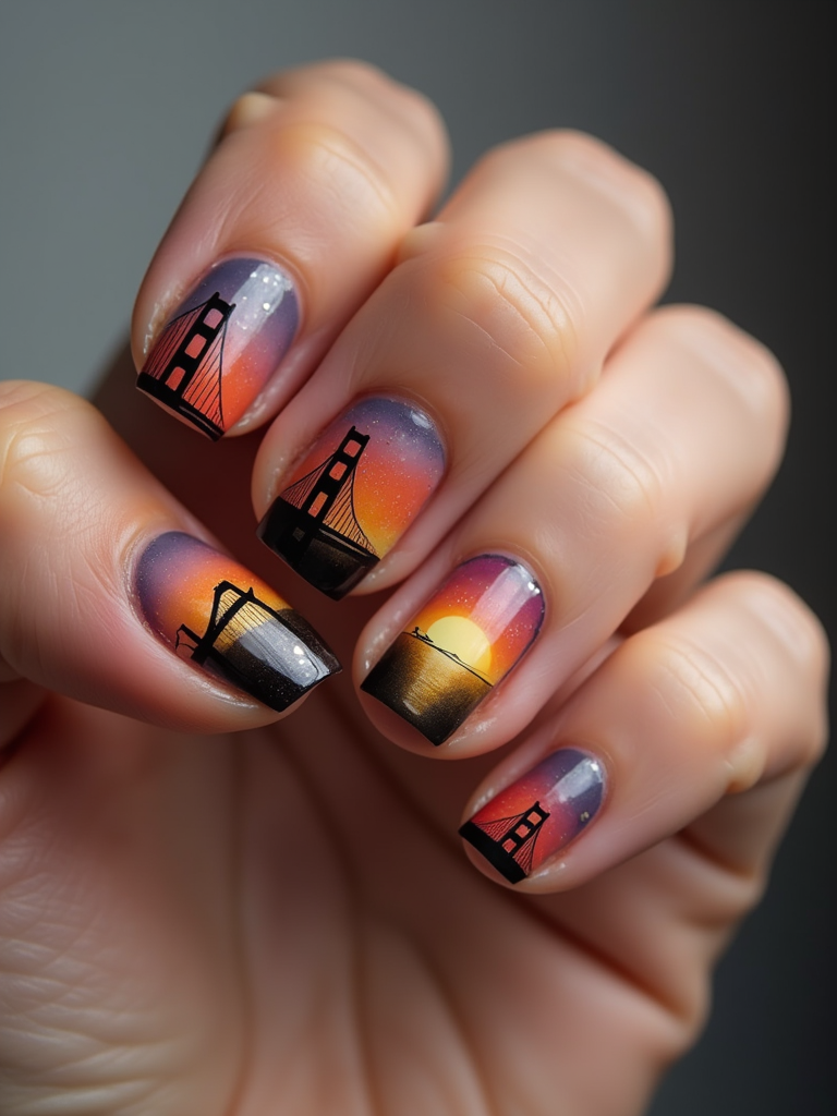 nails with detailed Golden Gate Bridge design, San Francisco skyline at sunset, clean softbox lighting, posed fingers with high gloss