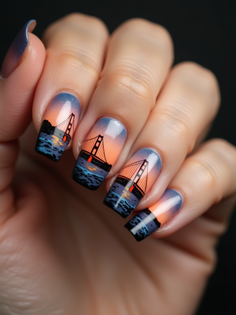 nails with detailed Golden Gate Bridge design, San Francisco skyline at sunset, clean softbox lighting, posed fingers with high gloss