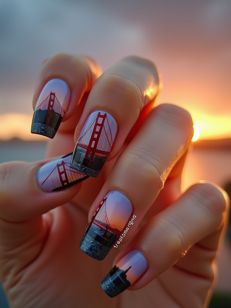 nails with detailed Golden Gate Bridge design, San Francisco skyline at sunset, clean softbox lighting, posed fingers with high gloss