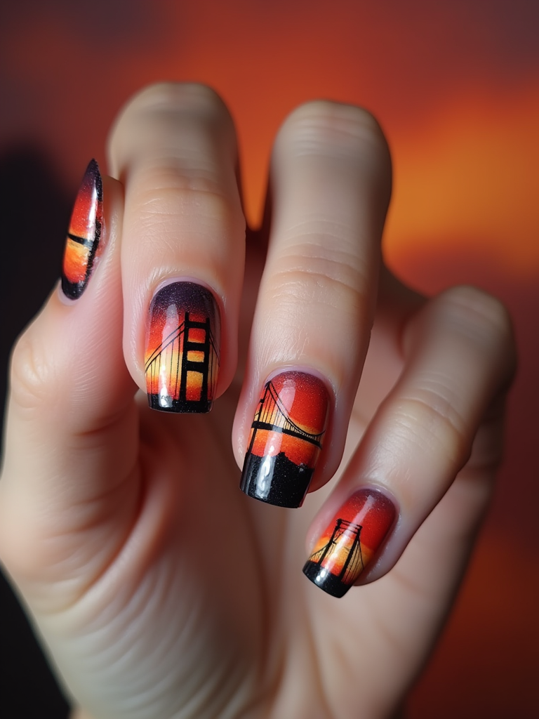 nails with detailed Golden Gate Bridge design, San Francisco skyline at sunset, clean softbox lighting, posed fingers with high gloss