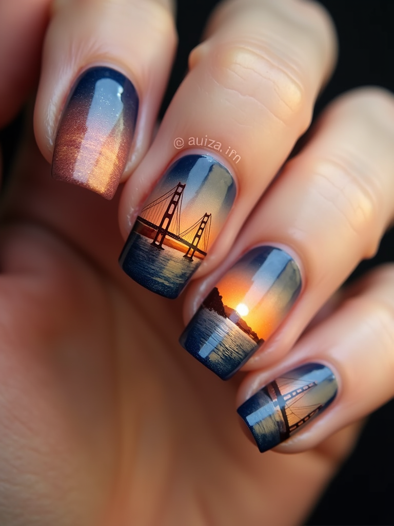 nails with detailed Golden Gate Bridge design, San Francisco skyline at sunset, clean softbox lighting, posed fingers with high gloss