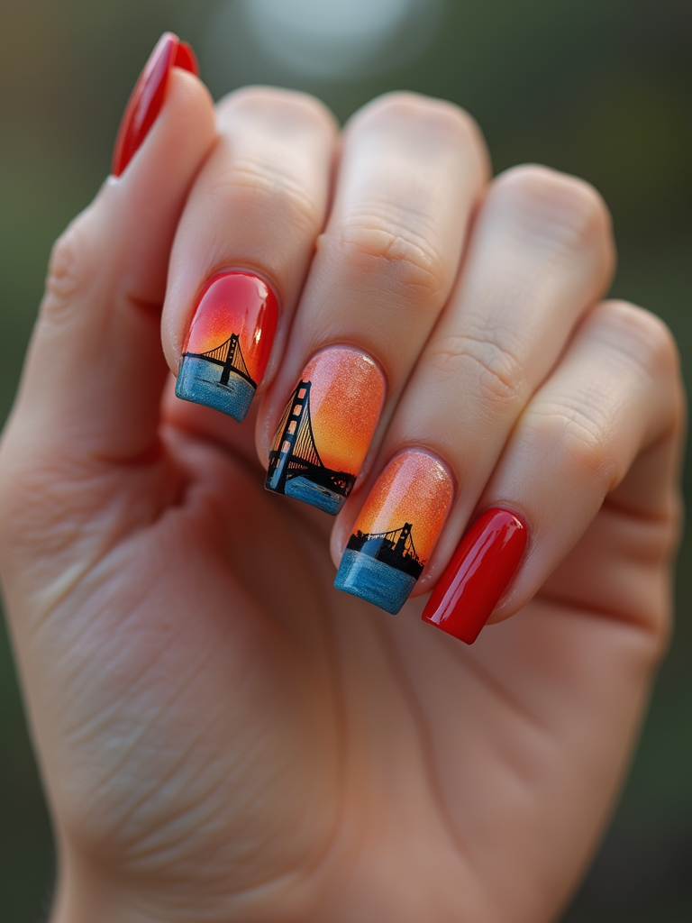 nails with detailed Golden Gate Bridge design, San Francisco skyline at sunset, clean softbox lighting, posed fingers with high gloss