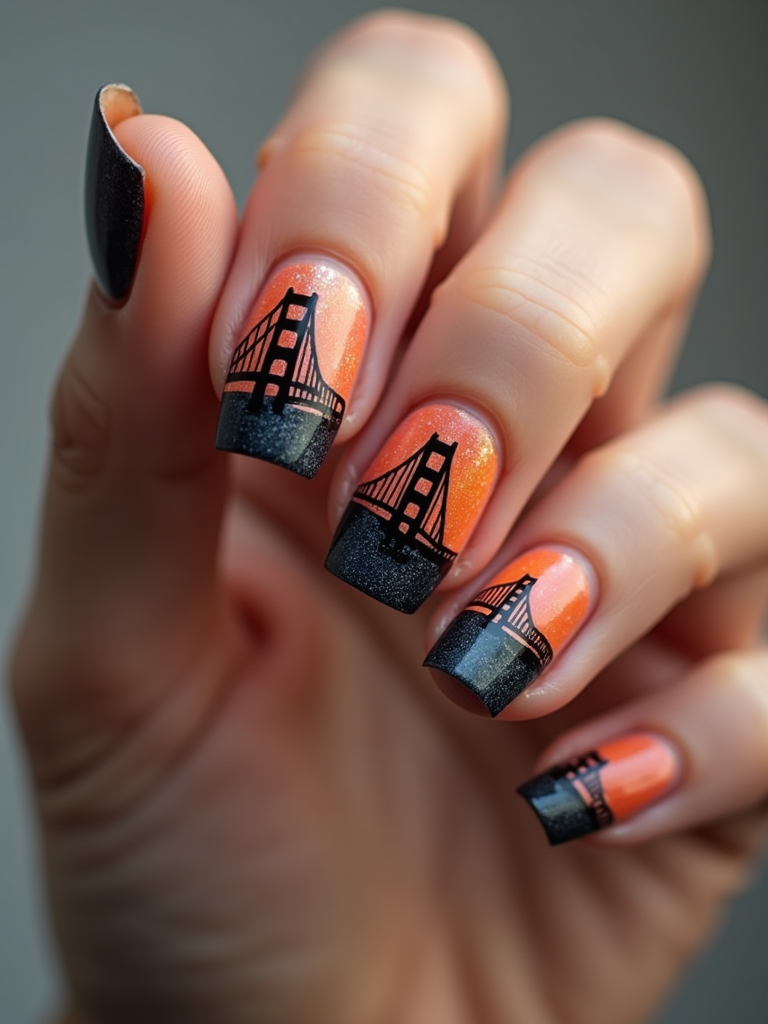 nails with detailed Golden Gate Bridge design, San Francisco skyline at sunset, clean softbox lighting, posed fingers with high gloss