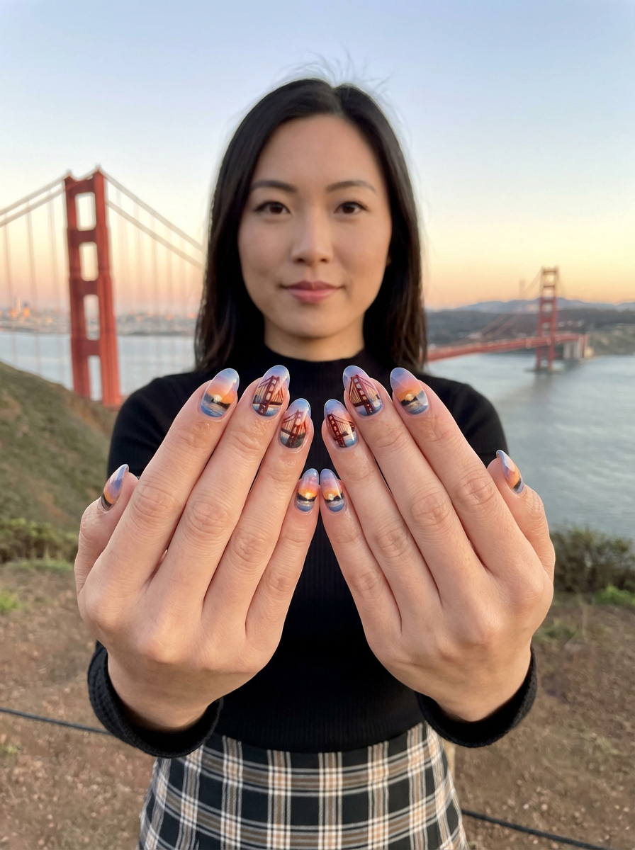nails with detailed Golden Gate Bridge design, San Francisco skyline at sunset, clean softbox lighting, posed fingers with high gloss