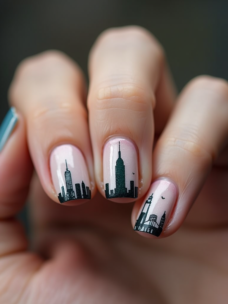 nails with detailed New York skyline silhouette, Empire State Building accent nail, urban aesthetic, professional beauty photography