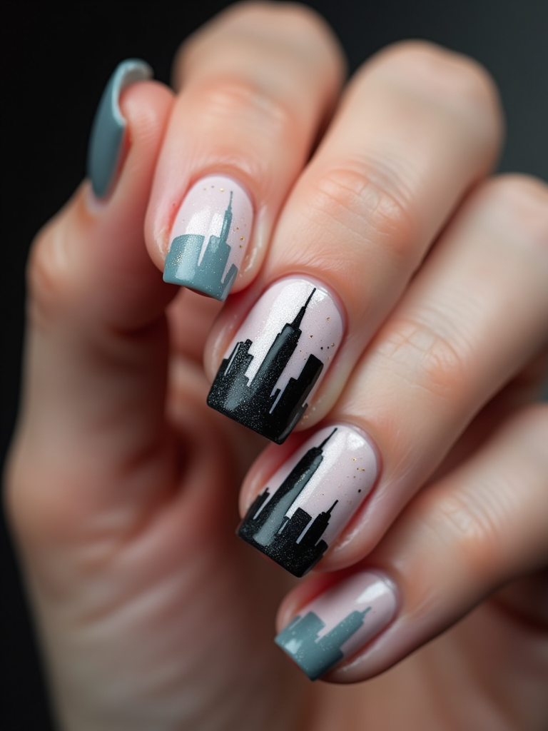 nails with detailed New York skyline silhouette, Empire State Building accent nail, urban aesthetic, professional beauty photography