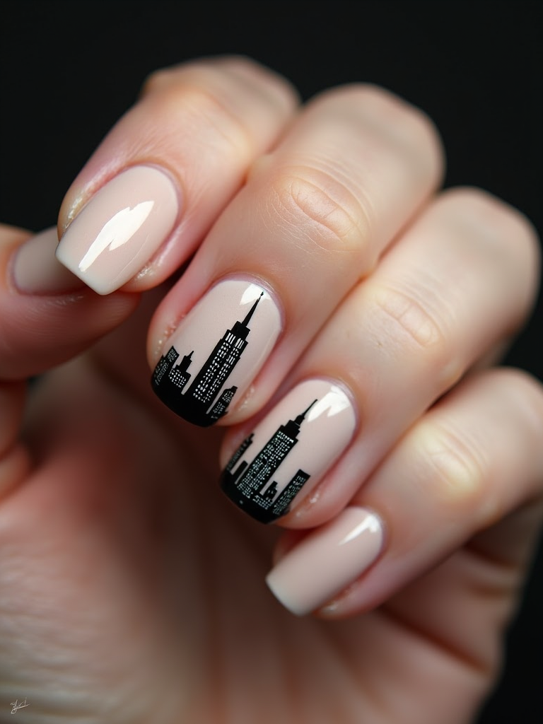 nails with detailed New York skyline silhouette, Empire State Building accent nail, urban aesthetic, professional beauty photography