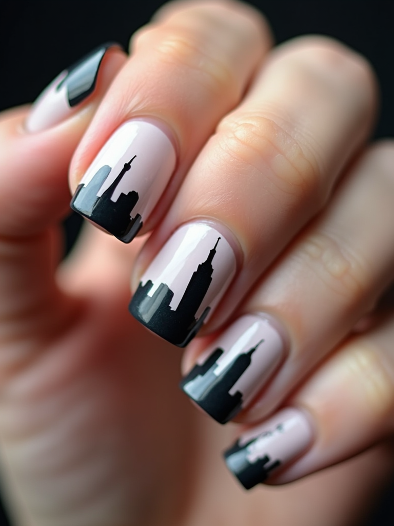 nails with detailed New York skyline silhouette, Empire State Building accent nail, urban aesthetic, professional beauty photography