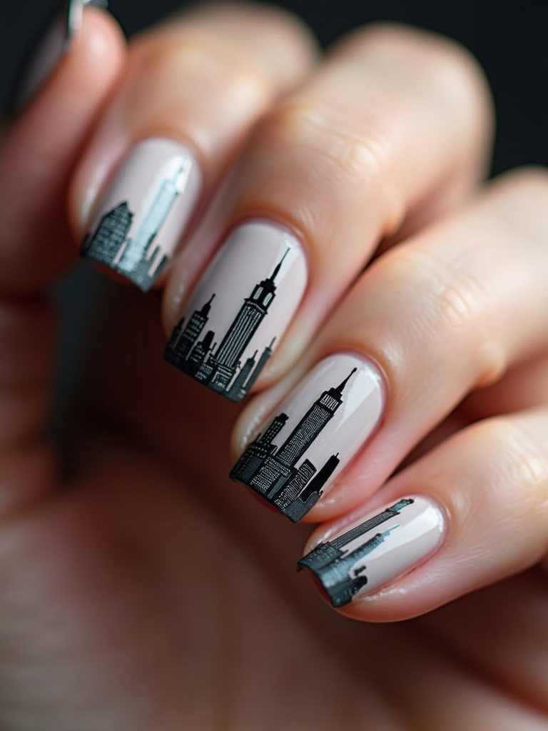 nails with detailed New York skyline silhouette, Empire State Building accent nail, urban aesthetic, professional beauty photography
