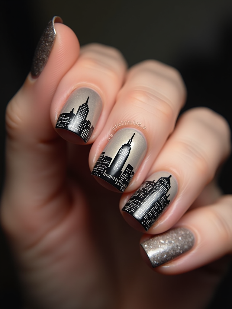 nails with detailed New York skyline silhouette, Empire State Building accent nail, urban aesthetic, professional beauty photography