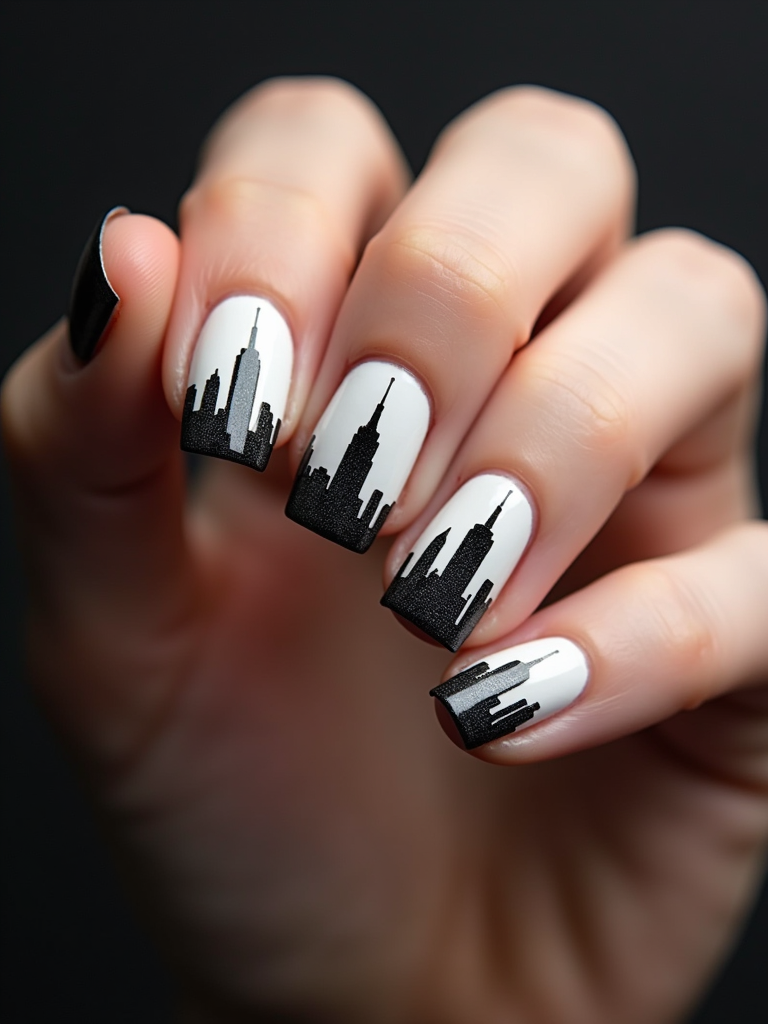 nails with detailed New York skyline silhouette, Empire State Building accent nail, urban aesthetic, professional beauty photography