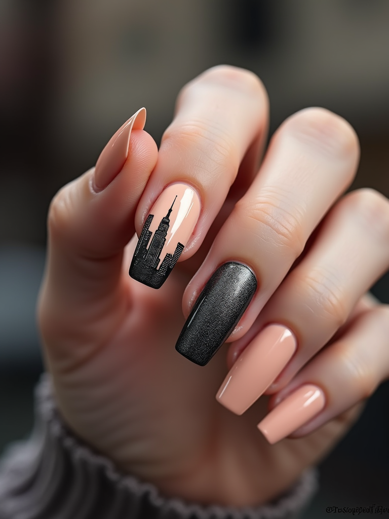 nails with detailed New York skyline silhouette, Empire State Building accent nail, urban aesthetic, professional beauty photography