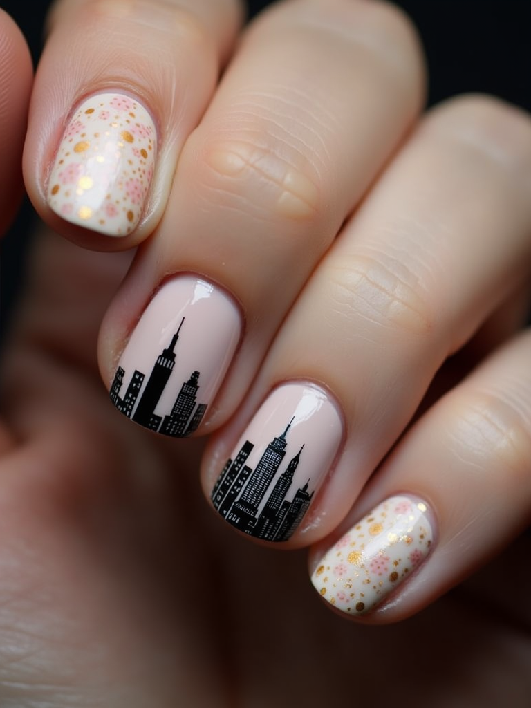 nails with detailed New York skyline silhouette, Empire State Building accent nail, urban aesthetic, professional beauty photography