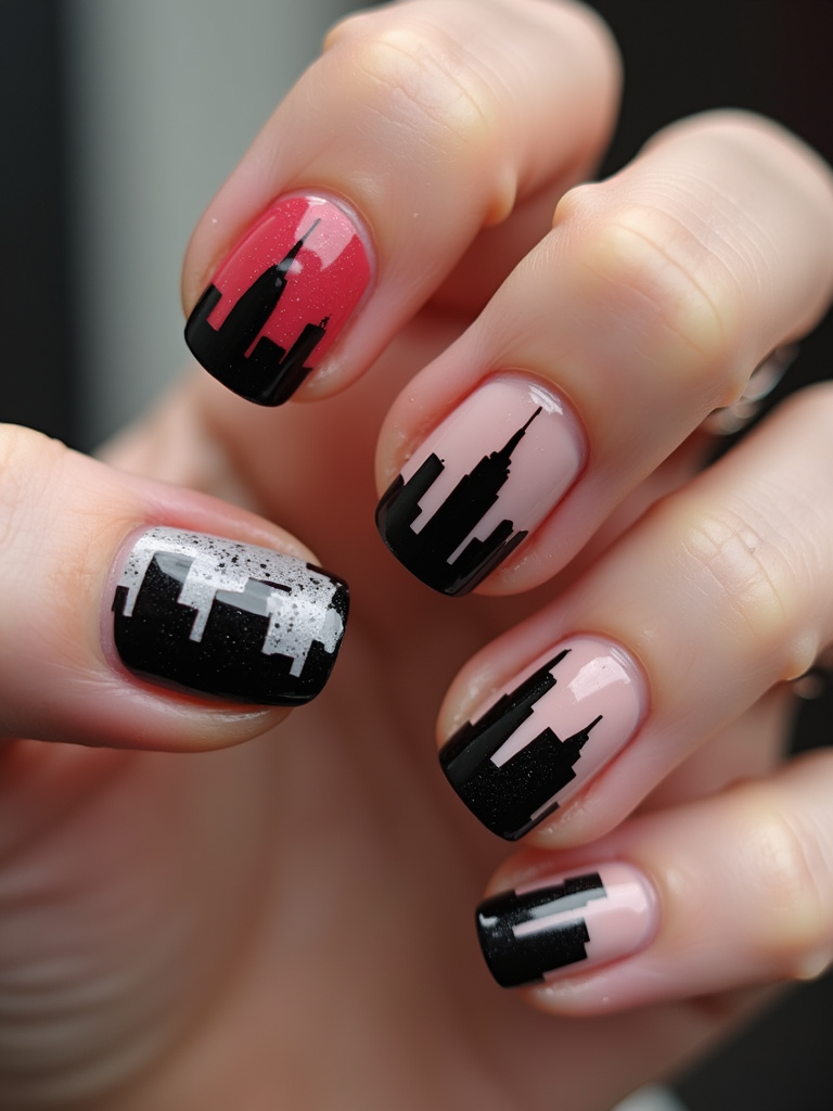 nails with detailed New York skyline silhouette, Empire State Building accent nail, urban aesthetic, professional beauty photography