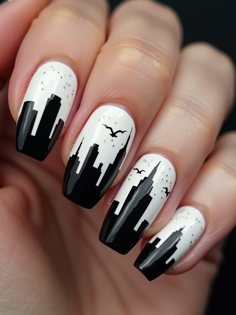 nails with detailed New York skyline silhouette, Empire State Building accent nail, urban aesthetic, professional beauty photography