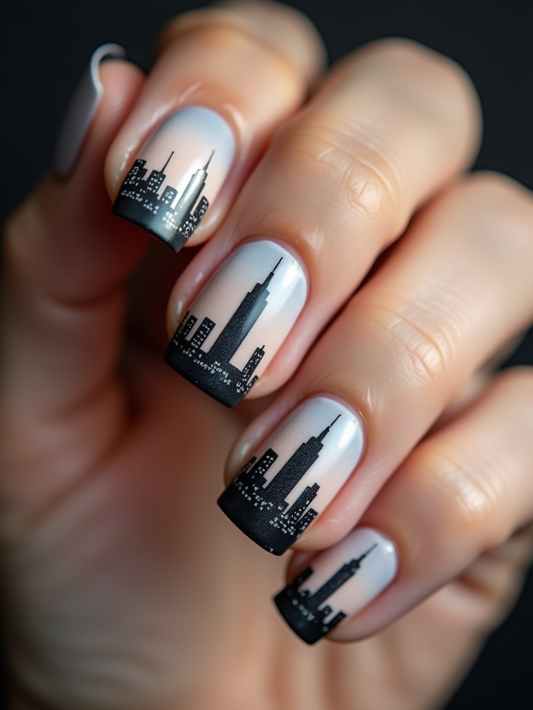nails with detailed New York skyline silhouette, Empire State Building accent nail, urban aesthetic, professional beauty photography