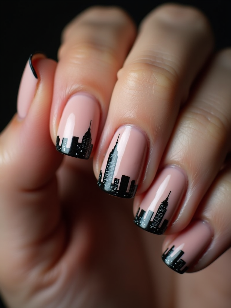 nails with detailed New York skyline silhouette, Empire State Building accent nail, urban aesthetic, professional beauty photography