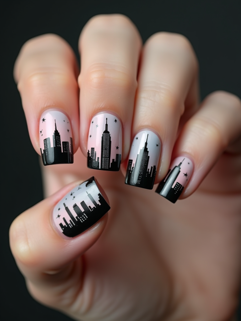 nails with detailed New York skyline silhouette, Empire State Building accent nail, urban aesthetic, professional beauty photography