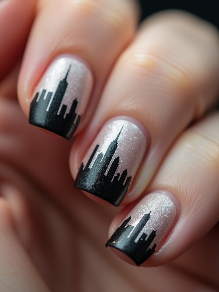 nails with detailed New York skyline silhouette, Empire State Building accent nail, urban aesthetic, professional beauty photography