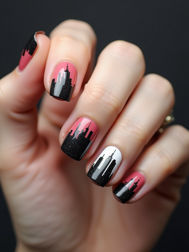 nails with detailed New York skyline silhouette, Empire State Building accent nail, urban aesthetic, professional beauty photography