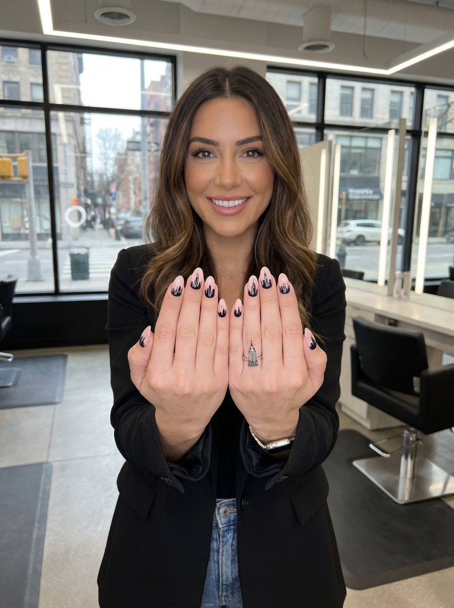 nails with detailed New York skyline silhouette, Empire State Building accent nail, urban aesthetic, professional beauty photography