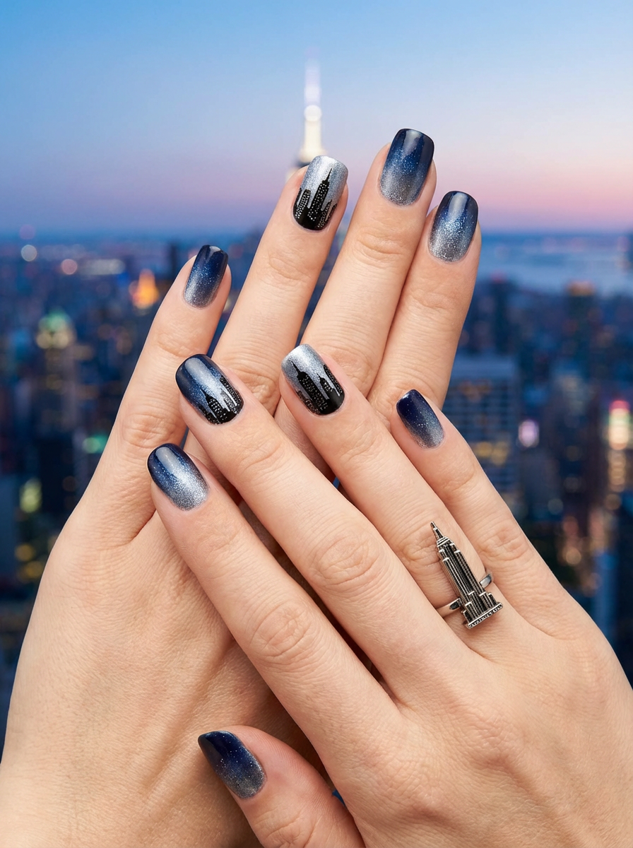 nails with detailed New York skyline silhouette, Empire State Building accent nail, urban aesthetic, professional beauty photography