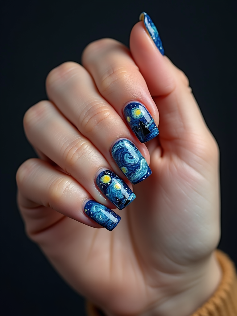 nails with starry night sky design inspired by Van Gogh, swirling blue and yellow patterns, clean softbox lighting, posed fingers with high gloss