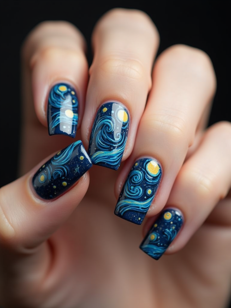 nails with starry night sky design inspired by Van Gogh, swirling blue and yellow patterns, clean softbox lighting, posed fingers with high gloss