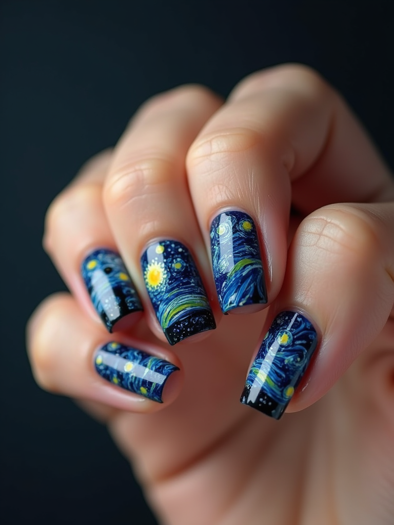 nails with starry night sky design inspired by Van Gogh, swirling blue and yellow patterns, clean softbox lighting, posed fingers with high gloss