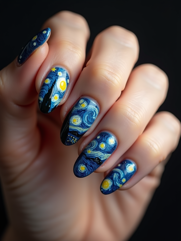 nails with starry night sky design inspired by Van Gogh, swirling blue and yellow patterns, clean softbox lighting, posed fingers with high gloss