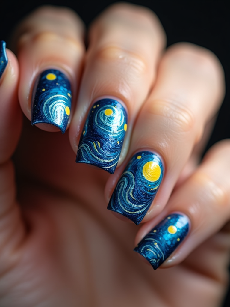 nails with starry night sky design inspired by Van Gogh, swirling blue and yellow patterns, clean softbox lighting, posed fingers with high gloss