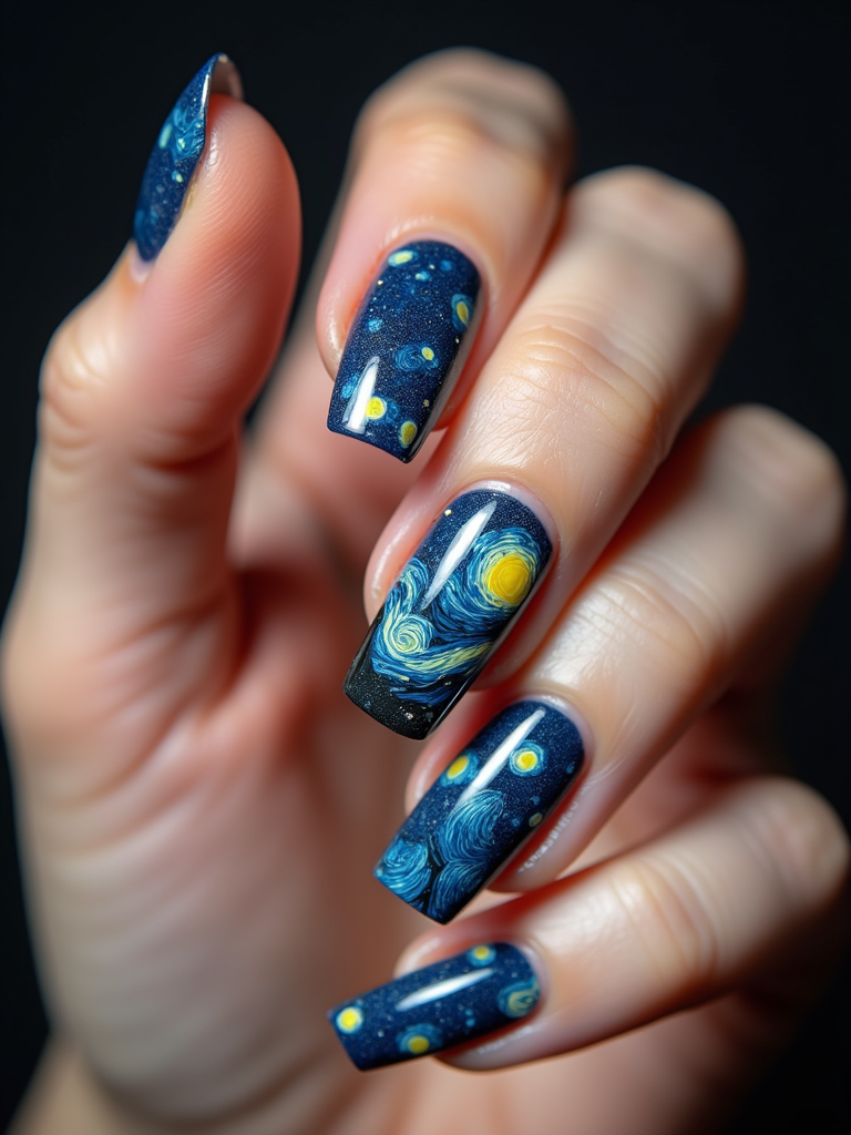nails with starry night sky design inspired by Van Gogh, swirling blue and yellow patterns, clean softbox lighting, posed fingers with high gloss