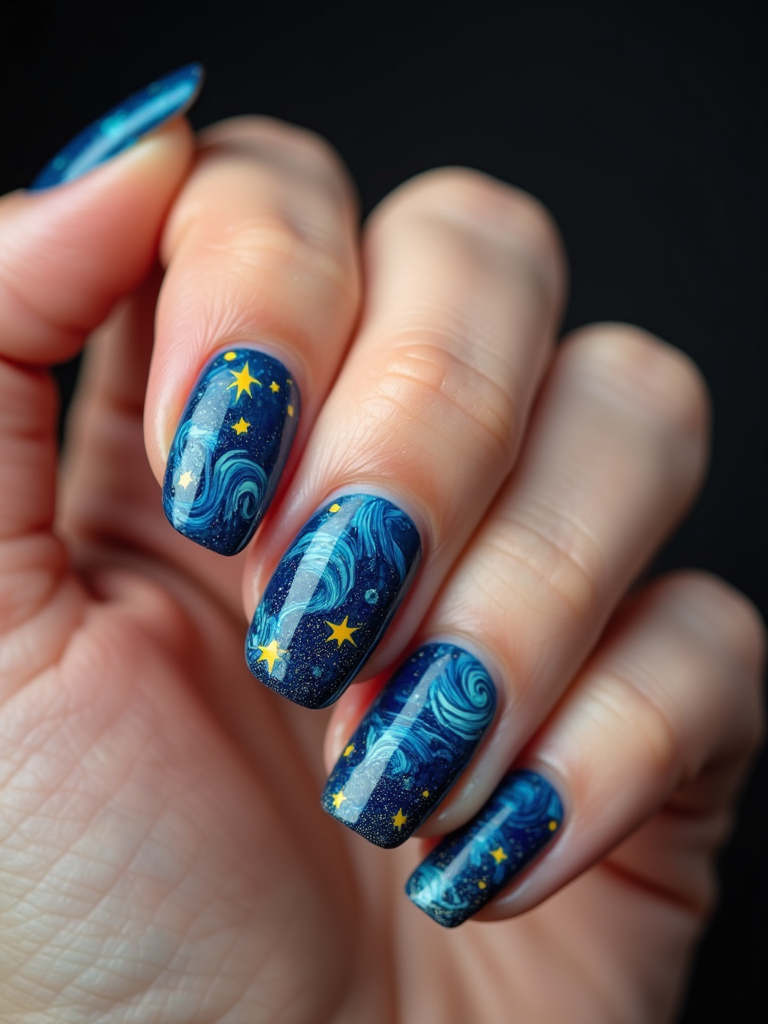 nails with starry night sky design inspired by Van Gogh, swirling blue and yellow patterns, clean softbox lighting, posed fingers with high gloss