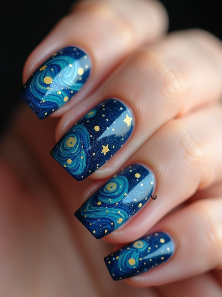 nails with starry night sky design inspired by Van Gogh, swirling blue and yellow patterns, clean softbox lighting, posed fingers with high gloss