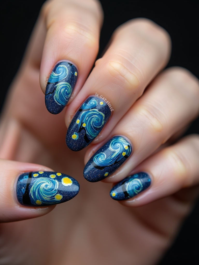 nails with starry night sky design inspired by Van Gogh, swirling blue and yellow patterns, clean softbox lighting, posed fingers with high gloss
