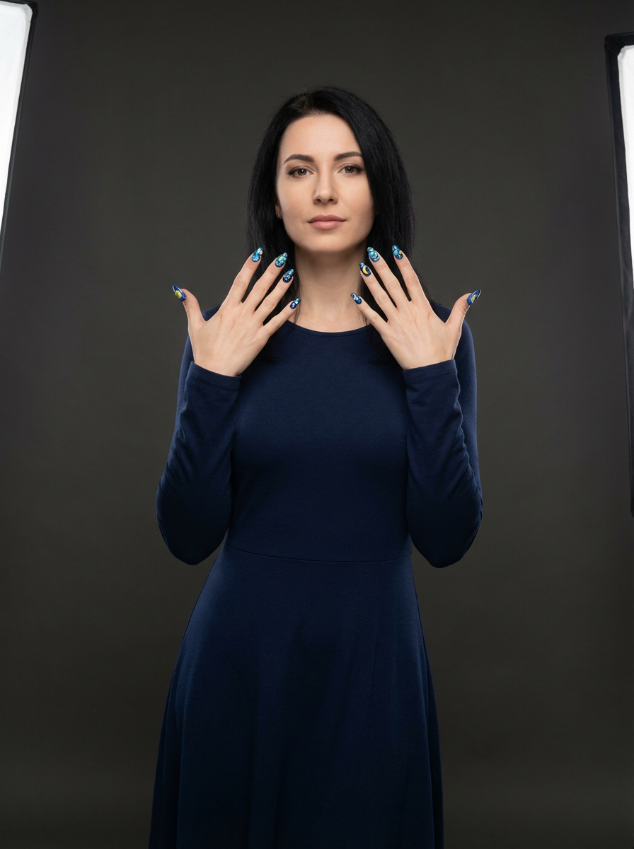 nails with starry night sky design inspired by Van Gogh, swirling blue and yellow patterns, clean softbox lighting, posed fingers with high gloss