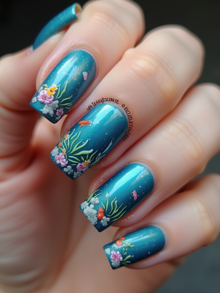 nails with underwater ocean scene featuring tiny sea creatures, vibrant blue ombré background, trendy and bold hand styling