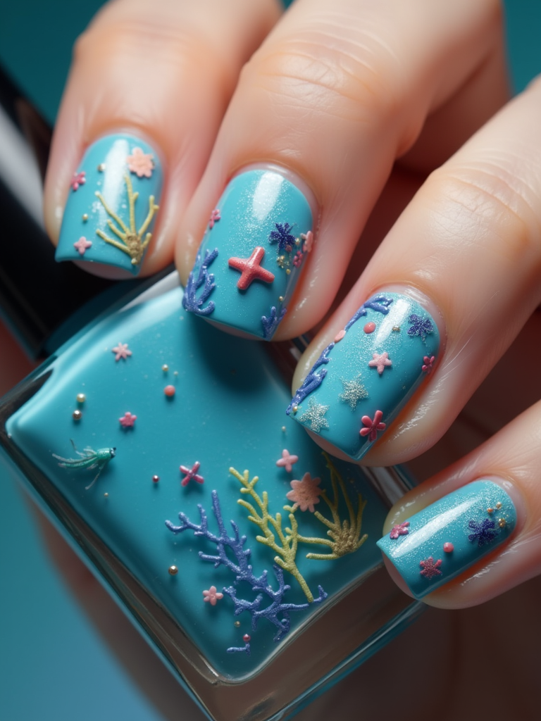 nails with underwater ocean scene featuring tiny sea creatures, vibrant blue ombré background, trendy and bold hand styling