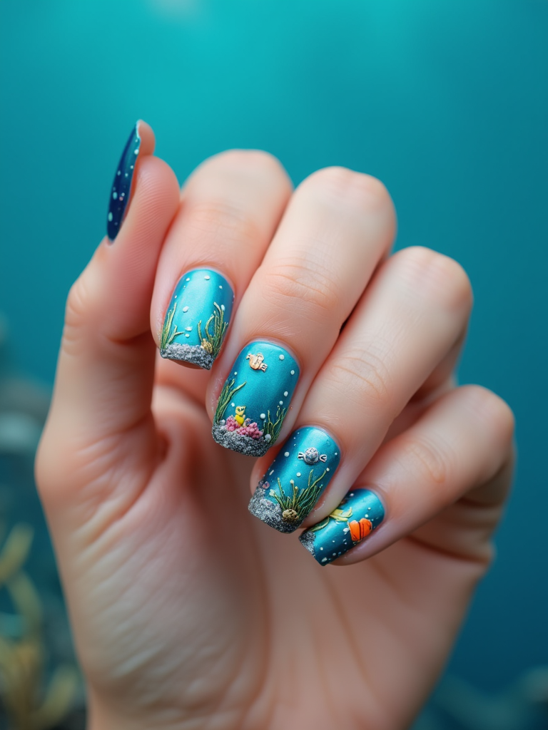 nails with underwater ocean scene featuring tiny sea creatures, vibrant blue ombré background, trendy and bold hand styling