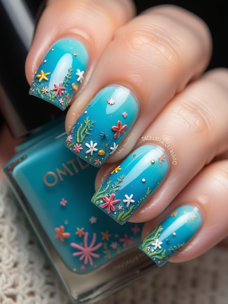 nails with underwater ocean scene featuring tiny sea creatures, vibrant blue ombré background, trendy and bold hand styling