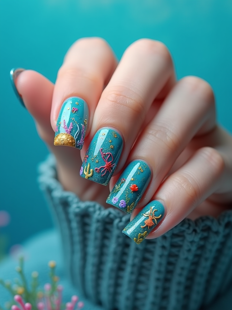 nails with underwater ocean scene featuring tiny sea creatures, vibrant blue ombré background, trendy and bold hand styling